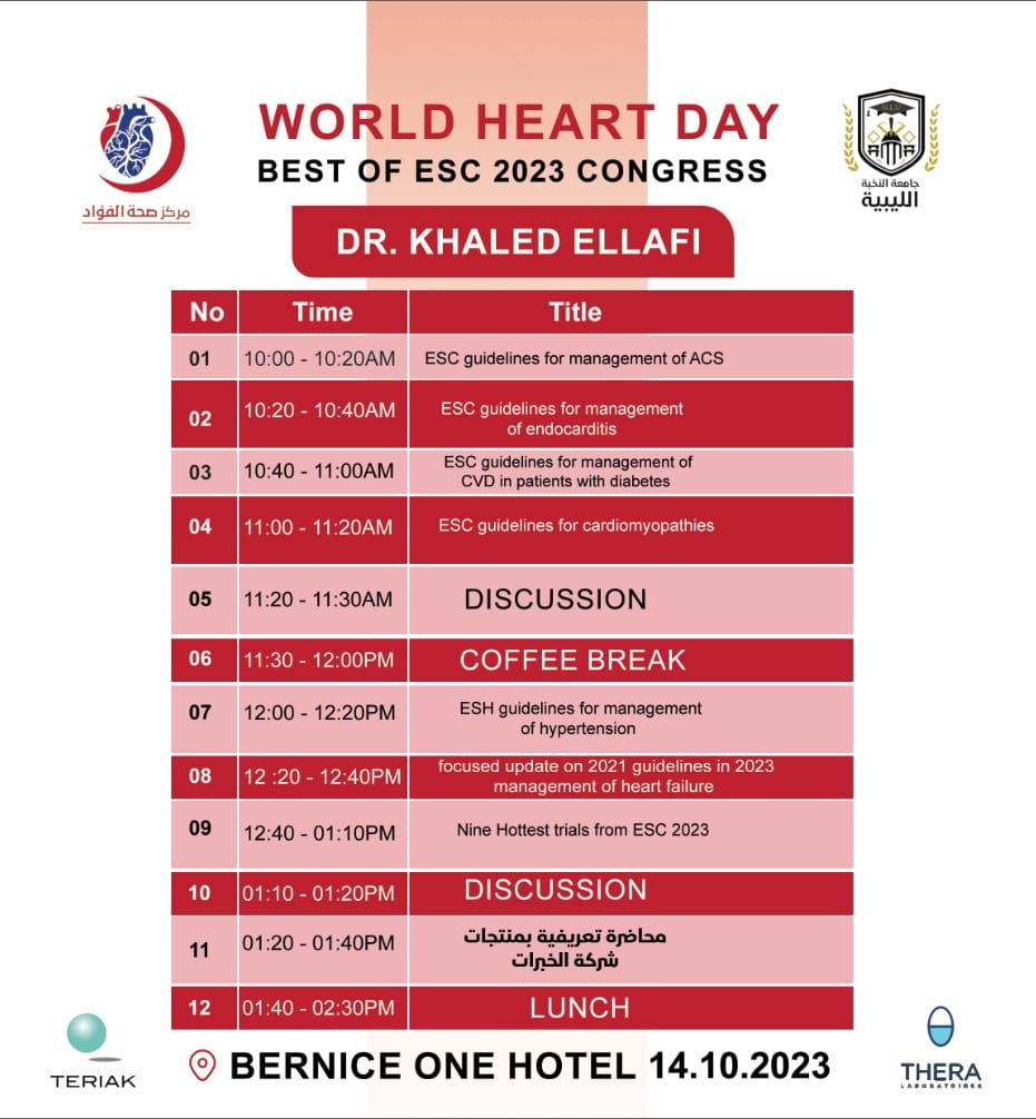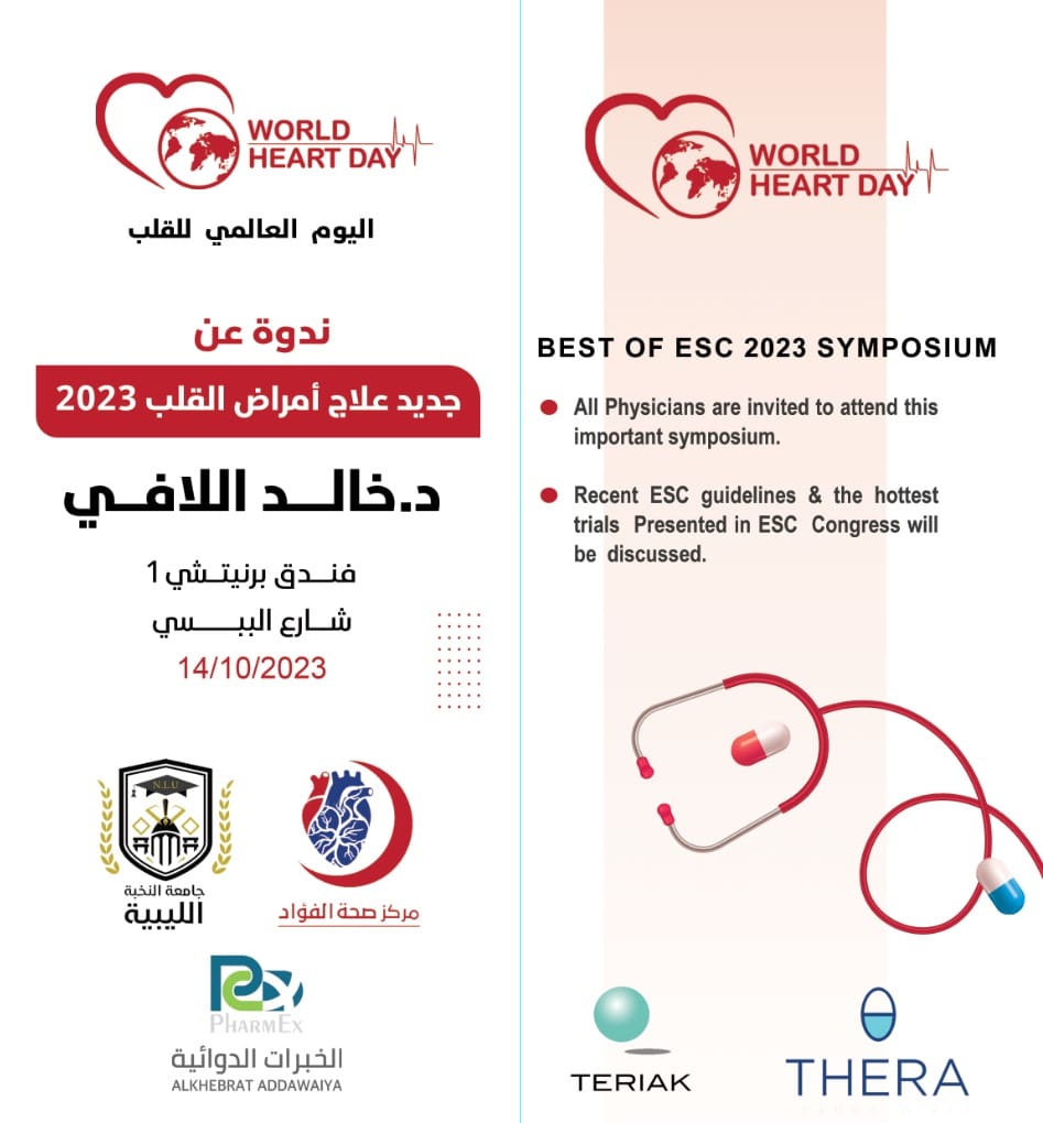 الأخوة أطباء القلب والباطنة يتشرف مركز صحة الفؤاد للقلب والشرايين وبدعم من جامعة النخبة الليبية وشركة الخبرات الدوائية بدعوتكم لحضور اليوم العلمي